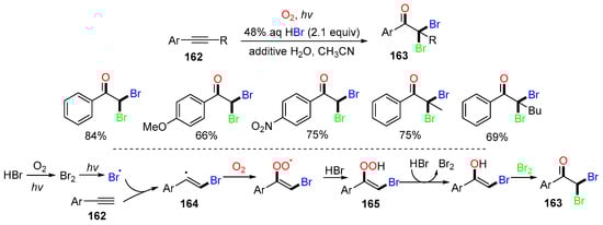 - Nobuta, T.; Hirashima, S.; Tada, N.; Miura, T.; Itoh, A. Facile aerobic photo-oxidative syntheses of α,α-dibromoacetophenones from aromatic alkynes with 48% aq HBr. Tetrahedron Lett. 2010, 51, 4576–4578. [Google Scholar] [CrossRef]