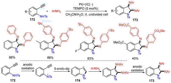 - Meng, X.; Xu, H.; Liu, R.; Zheng, Y.; Huang, S. Electrochemical triamination of alkynes: Controllable synthesis of functionalized indolines and indoles. Green Chem. 2022, 24, 4476–4754. [Google Scholar] [CrossRef]