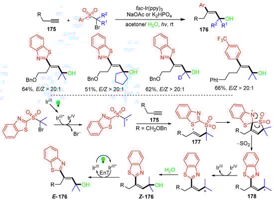 - Wang, J.; Wu, X.; Cao, Z.; Zhang, X.; Wang, X.; Li, J.; Zhu, C. E-selective radical difunctionalization of unactivated alkynes: Preparation of functionalized allyl alcohols from aliphatic alkynes. Adv. Sci. 2024, 11, e2309022. [Google Scholar] [CrossRef]