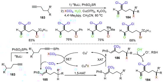 - Feng, J.; Zhang, F.; Shu, C.; Zhu, G. Copper-catalyzed 1,2,5-trifunctionalization of terminal alkynes using SR as a transient directing group for radical translocation. Chin. J. Chem. 2022, 40, 1667–1673. [Google Scholar] [CrossRef]