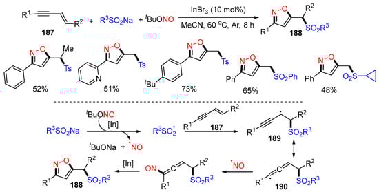 - Yue, X.; Hu, M.; He, X.; Wu, S.; Li, J.-H. A radical-mediated 1,3,4-trifunctionalization cascade of 1,3-enynes with sulfinates and tert-butyl nitrite: Facile access to sulfonyl isoxazoles. Chem. Commun. 2020, 56, 6253–6256. [Google Scholar] [CrossRef]