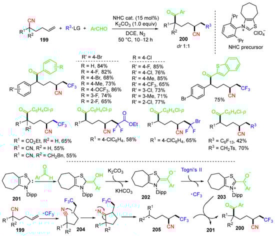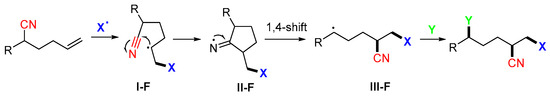 - Chang, C.; Zhang, H.; Wu, X.; Zhu, C. Radical trifunctionalization of hexenenitrile via remote cyano migration. Chem. Commun. 2022, 58, 1005–1008. [Google Scholar] [CrossRef]