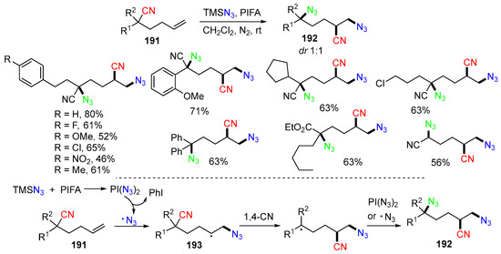 - Wu, Z.; Ren, R.; Zhu, C. Combination of a cyano migration strategy and alkene difunctionalization: The elusive selective azidocyanation of unactivated olefins. Angew. Chem. Int. Ed. 2016, 55, 10821–10824. [Google Scholar] [CrossRef]