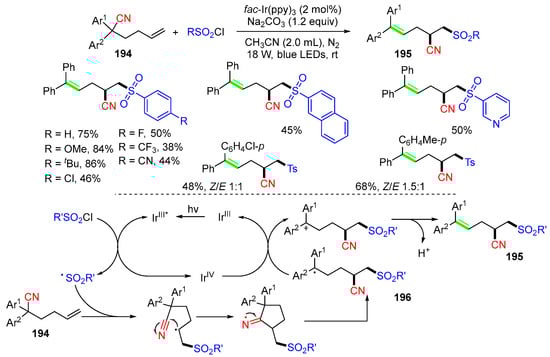 - Bao, P.; Yu, F.; He, F.-S.; Tang, Z.; Deng, W.-P.; Wu, J. Visible-light-induced remote C(sp3)−H sulfonylvinylation: Assembly of cyanoalkylated vinyl sulfones. Org. Chem. Front. 2021, 8, 4820–4825. [Google Scholar] [CrossRef]