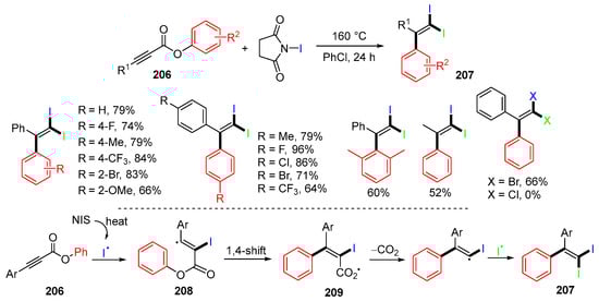 - Ni, S.; Sha, W.; Zhang, L.; Xie, C.; Mei, H.; Han, J.; Pan, Y. N-iodosuccinimide-promoted cascade trifunctionalization of alkynoates: Access to 1,1-diiodoalkenes. Org. Lett. 2016, 18, 712–715. [Google Scholar] [CrossRef] [PubMed]