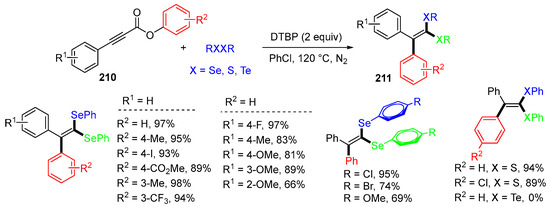 - Sahoo, H.; Ramakrishna, I.; Mandal, A.; Baidya, M. Atom transfer oxidative radical cascade of aryl alkynoates towards 1,1-dichalcogenide olefins. Chem. Asian J. 2019, 14, 4549–4552. [Google Scholar] [CrossRef] [PubMed]
