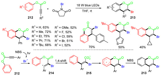 - Feng, S.; Li, J.; Liu, Z.; Sun, H.; Shi, H.; Wang, X.; Xie, X.; She, X. Visible-light-mediated radical cascade reaction: Synthesis of 3-bromocoumarins from alkynoates. Org. Biomol. Chem. 2017, 15, 8820–8826. [Google Scholar] [CrossRef]