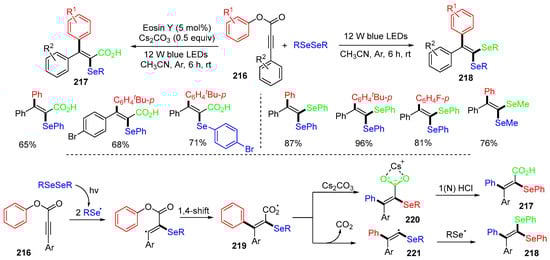 - Roy, M.; Jamatia, R.; Samanta, A.; Mohar, K.; Srimani, D. Change in the product selectivity in the visible light-induced selenium radical-mediated 1,4-aryl migration process. Org. Lett. 2022, 24, 8180–8185. [Google Scholar] [CrossRef]