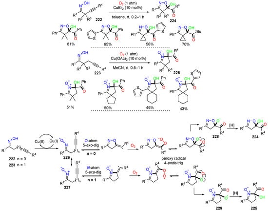 - Peng, X.; Wei, D.; Han, W.; Chen, F.; Yu, W.; Han, B. Dioxygen activation via Cu-catalyzed cascade radical reaction: An approach to isoxazoline/cyclic nitrone-featured α-ketols. ACS Catal. 2017, 7, 7830–7834. [Google Scholar] [CrossRef]