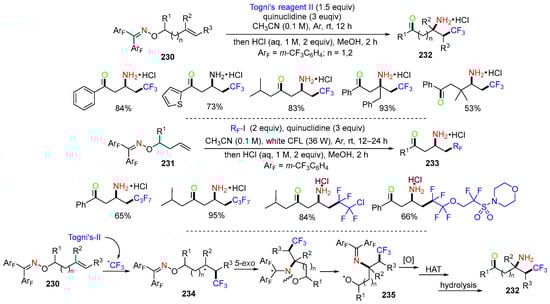 - Jiang, H.; Studer, A. Intermolecular radical carboamination of alkenes. Chem. Soc. Rev. 2020, 49, 1790–1811. [Google Scholar] [CrossRef]
