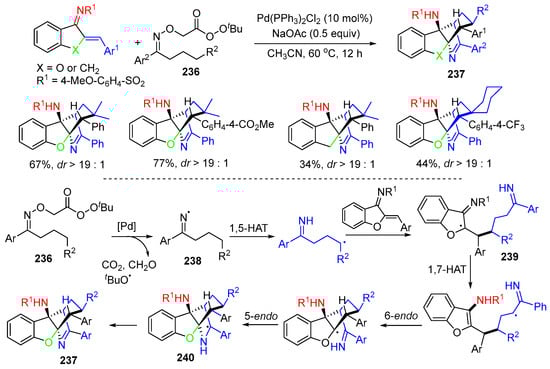 - Jiang, K.; Li, S.J.; Liu, Q.P.; Yu, N.; Li, Y.L.; Zhou, Y.Q.; He, K.C.; Lin, J.; Zheng, T.Y.; Lang, J.; et al. Iminyl radical-triggered relay annulation for the construction of bridged aza-tetracycles bearing four contiguous stereogenic centers. Chem. Sci. 2022, 13, 7283–7288. [Google Scholar] [CrossRef] [PubMed]