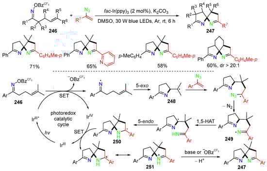 - Xia, D.; Shi, Y.; Jiang, L.; Li, Y.; Kong, J. Recent advances in the radical cascade reaction for constructing nitrogen heterocycles using azides as radical acceptors. Org. Biomol. Chem. 2024, 22, 5511–5523, advance article. [Google Scholar] [CrossRef]