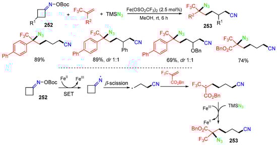 - Liu, S.; Zhang, L.; Xu, L.; Gao, P.; Duan, X.; Guo, L.N. Fe-catalyzed alkylazidation of α-trifluoromethylalkenes: An access to quaternary stereocenters containing CF3 and N3 groups. Org. Lett. 2023, 25, 1336–1341. [Google Scholar] [CrossRef]
