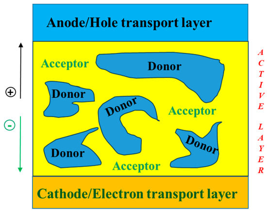 In such a system, the active layer is obtained by blending a conjugated polymer serving as a donor (D) with an electron acceptor (A) to form bicontinuous interpenetrating networks at the nanoscale in order to favor separation into free carriers of the tightly bounded electron–hole pairs at the D/A interface, namely, excitons formed upon light excitation, and to allow migration of the charges to the respective electrodes (Scheme 1).