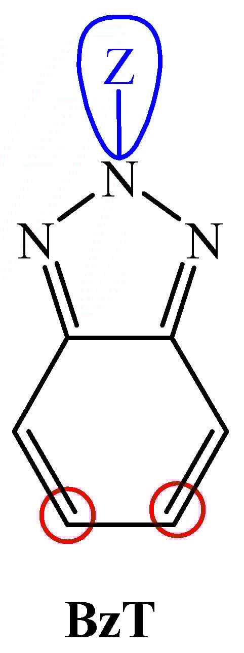 Among the various acceptors for constructing the p-type semiconductor benzotriazole, BzT (Figure 2), a nitrogen-containing heterocyclic benzazole derivative is a moderately electron-deficient unit due to the diimine structure which offers the following chemically functionalizable sites [13,14]: