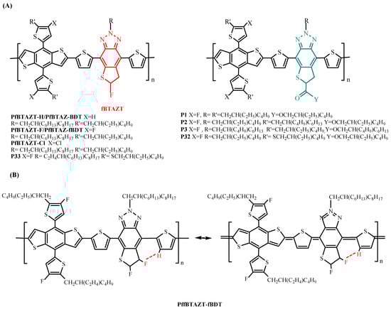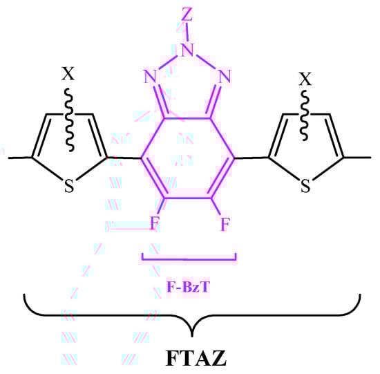 The 5,6-difluorobenzotriazole unit provides a lot of advantages for the constructions of conjugated polymers in comparison to simple BzT-based polymers [24,25,26,27,28,29,30,31,32], which may be attributed to its small van der Waals radius of 1.35 Å and high electronegativity, effectively modifying the energy levels and enhancing optical absorption without a negative influence on molecular packing. This unit with two flanking thiophenes, called FTAZ, is the most largely used BzT-based acceptor core (Figure 4).