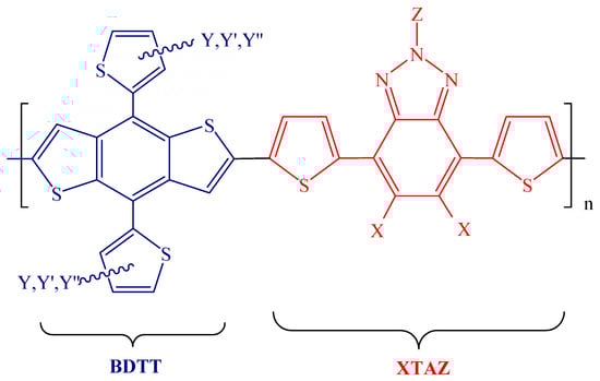 The use of NFAs was definitely a breakthrough in the development of OSCs, and in particular WBG (Eg 1.9–2.0 eV) polymers with a D–A molecular skeleton of thienyl benzodithiophene-alt-4,7-bis(thiophen-2-yl)benzotriazole (BDTT-alt-XTAZ), Figure 8, have become widely used and successful material systems due to their strong optical absorption in the wavelength range of 400–650 nm with a high absorption coefficient of ∼105 cm−1 in film, ordered molecular packing, high hole mobility of ∼10−3 cm2 V−1 s−1, and favorable morphological insensitivity [43].