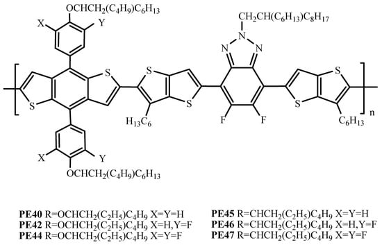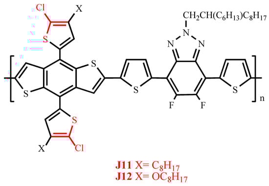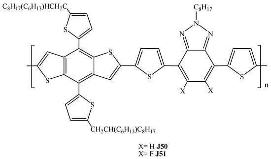 The first polymers J50 and J51, Figure 9, were synthesized by Min et al. [44] who observed their two-dimensional character and the redshift in their absorption spectrum with respect to the linear copolymer analogues with alkoxy side-chains or alkyl side-chains on the BDT unit.