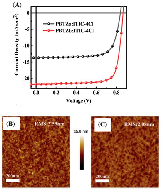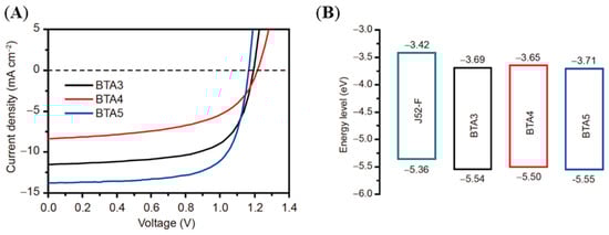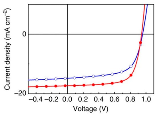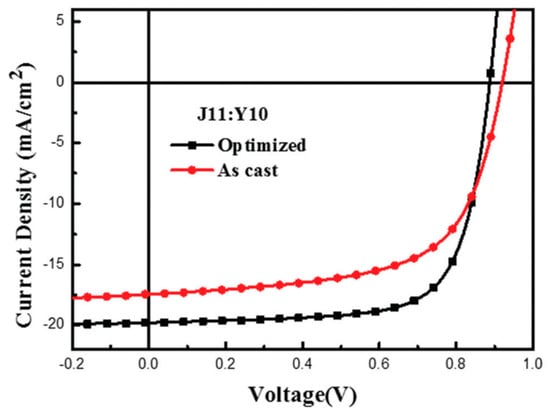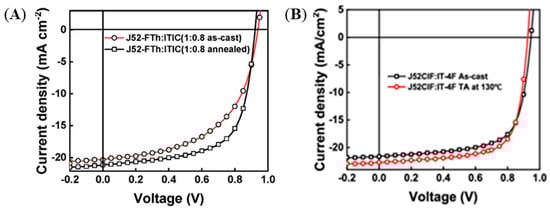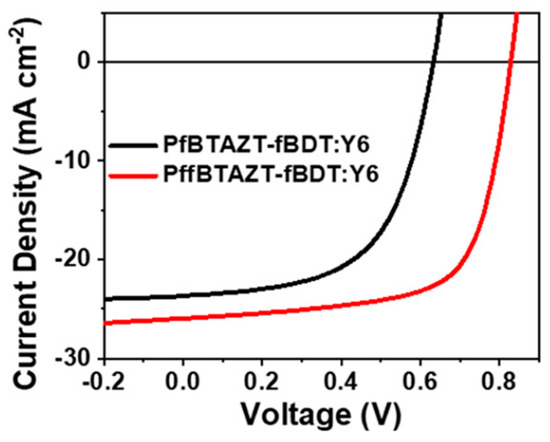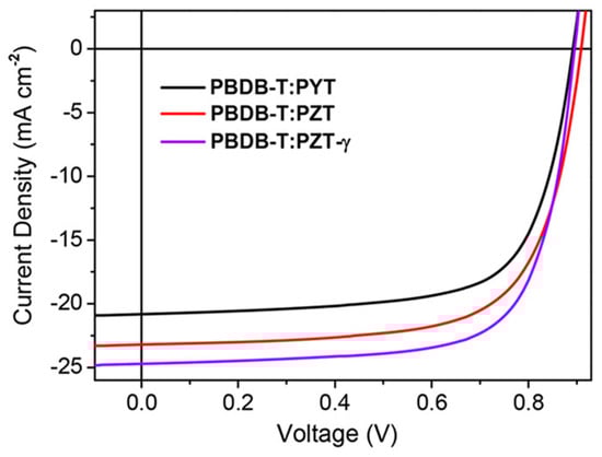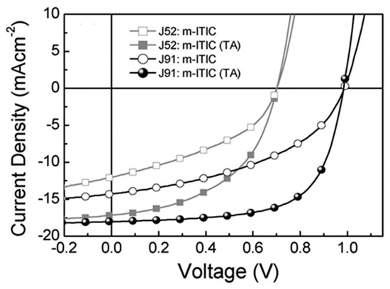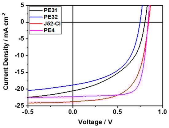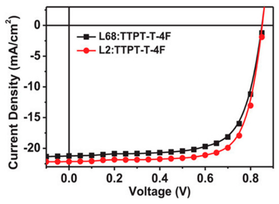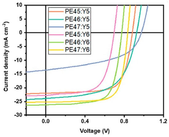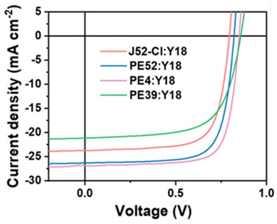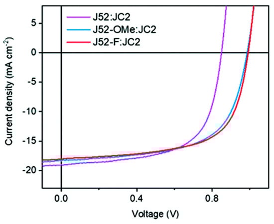 This was tested with various acceptors [50,52,53,54,55,56,57,58,59] (Table 2), the best performance being obtained when J52 was paired to a JC2 acceptor (PCE 10.27%) (the J-V curve is shown in Figure 12) [56].