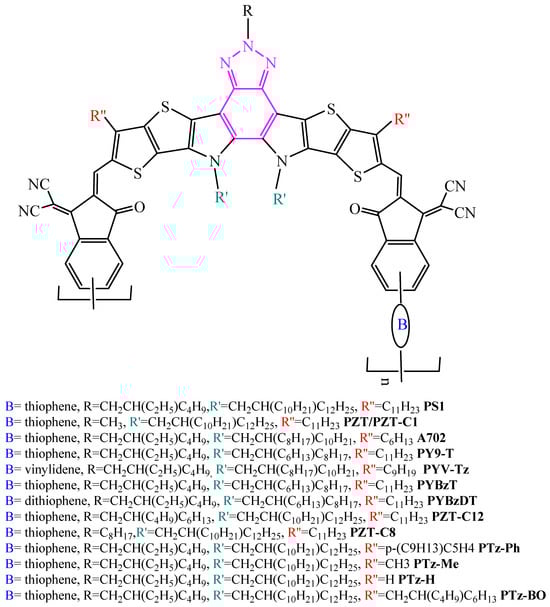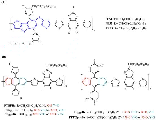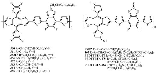 Except for a few polymers in which the alkyl group bound to BDTT in the α-position was substituted by an ethynyl derivative (2-triisopropylsilylethynyl) [46] or linear hexyl/octyl chain [47,48,49], research was devoted to the study of polymers with the 2-ethylhexyl group, J52 [50] Figure 11, also indicated as PBZ [51] or PBDT(T)FTAZ [52].