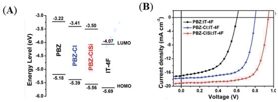 On the other hand, regarding the n-type organic semiconductor of the active layer, fullerene derivatives have been widely used and investigated as acceptors because of their strong electron-accepting ability, high electron mobility, and ability to form proper-sized BHJ domains in PSC devices [15]. In order to overcome their weak absorption in the visible spectral region, limited energy level tunability, and the inadequate long-term stability of the devices caused by the susceptibility to dimerization and gradual aggregation, thanks to the invention of the A–D–A-structured small-molecule non-fullerene acceptor ITIC [16], in the last decade, non-fullerene acceptors (NFAs), consisting of organic small molecules or polymers, have been developed and successfully employed in OSCs with effective improvement to PCE [17,18] which can be achieved by following such important criteria: (1) complementary absorptions between donor and acceptor components to enhance light harvesting; (2) matching energy levels to ensure efficient charge separation and to minimize voltage loss (Vloss, defined as Vloss = Egap/q − Voc, where Egap is the lowest optical bandgap among the donor and acceptor components); (3) balanced charge mobilities to avoid charge accumulation at device interfaces; and (4) favorable morphology including high crystallinity, face-on orientation, and small domain size [19].