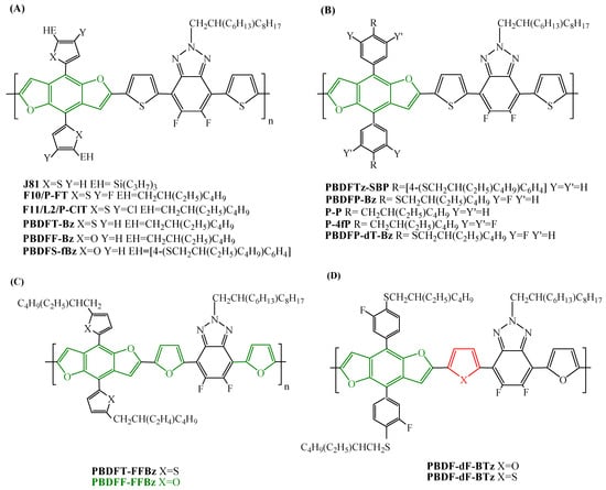- Wang, D.X.; Dou, K.K.; Cui, W.; Li, F.; Jing, X.; Yu, L.M.; Sun, M.L. VOC enhancement of thienobenzofuran and benzotriazole backboned photovoltaic polymer by side chain sulfuration or fluoridation. Dye. Pigment. 2021, 184, 108775. [Google Scholar] [CrossRef]