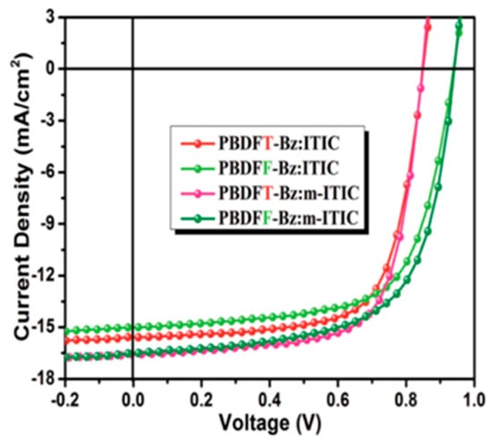 The combination of J51 with the polymer acceptor N2200 allowed researchers to produce the first all-polymer cell containing a BzT-based polymer donor, with PCE of 8.28% [24]. Better efficiency was achieved with ITIC (PCE 9.26%), having a stronger absorbance than N2200 in the longer-wavelength region [45]: the J-V curves are reported in Figure 10.