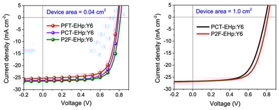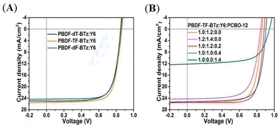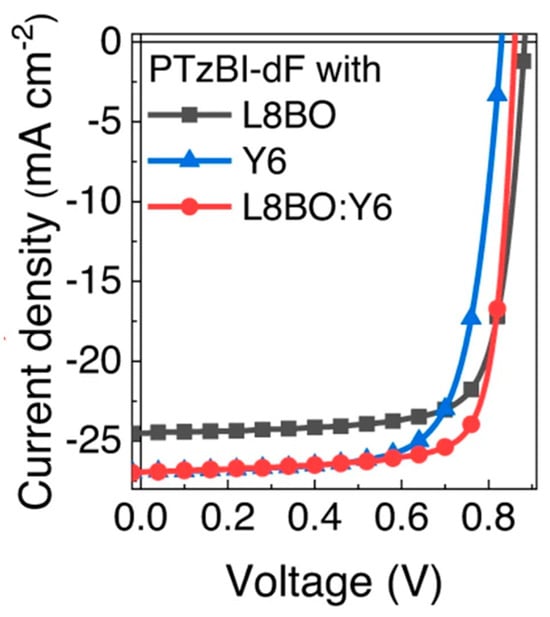 However, when the polymer was blended with NFAs, the PCE of the OSC containing such active layers increased except with SF-PDI2 [25] (Table 1), reaching the maximum value of 13.03% without additive and IDIC [34] or 13.58% with 1,8-diiodooctane (DIO) and chloronaphthalene (CN) with IDCIC [35]; the corresponding J-V curves are reported in Figure 7.