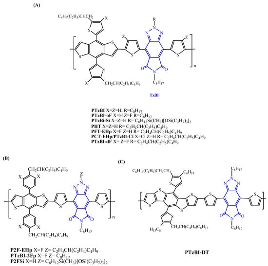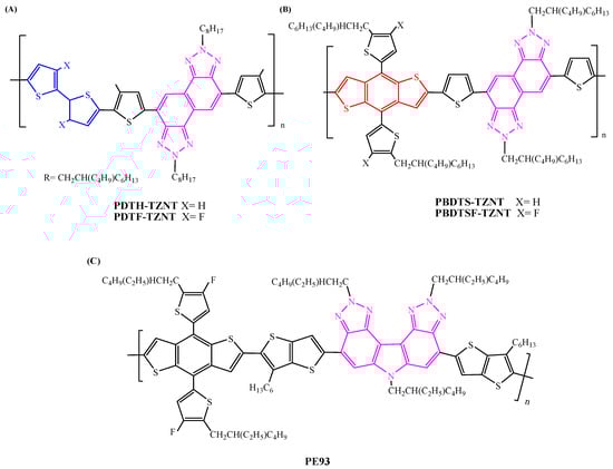 Considering the acceptor, it is possible to identify two main groups of polymers, one based on 5,6-difluorobenzotriazole (F-BzT) and one on the π-extended BzT unit consisting of the BzT unit condensed with various rings.