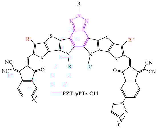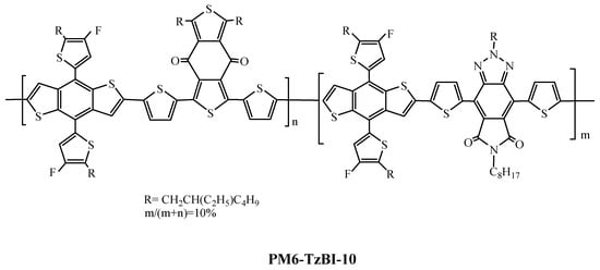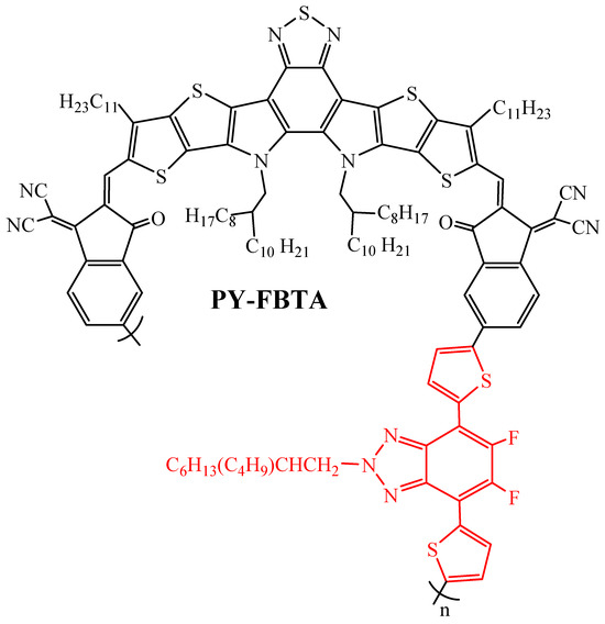 The literature is very rich with papers dealing with BzT-based D-A conjugated polymers, but to the best of my knowledge in NFAs-OSC, only three polymers (Figure 3) are precisely characterized by the formula D-A containing a benzotriazole-based electron-deficient unit directly linked to a donor, specifically, two benzo [1,2-b:4,5-b′]dithiophene derivatives (polymers PY1 and PY39) [20,21] or a fluorene derivative (polymer PBTA-FN) [22].