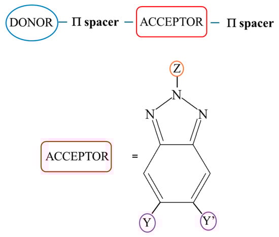 It is common to indicate conjugated polymers generally as D-A species, but to be clear and precise, most of the polymers are characterized more properly by a formula such as D-π spacer-A-π spacer, as in Scheme 3; the D unit can be a single or a group of molecules, the π spacer is a bridging unit, specifically furan, thiophene, selenophene, and thieno[3,2-b]thiophene, and A is a BzT derivative, which contains different organic or siloxane groups Z on the azole nitrogen and Y,Y′ substituents consisting of H, Cl, F, CN, OR, or forming a ring condensed with BzT.