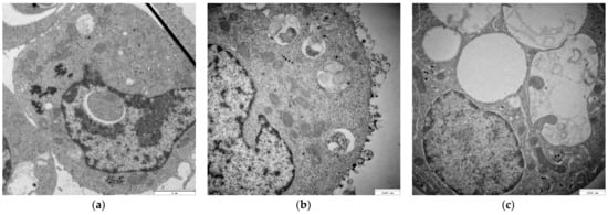 TEM micrographs of COLO-720L cells: (a) before and after 24 h of exposure to (b) CYS-AgNPs(+) and (c) CYS-AgNPs(−) at concentrations of 5 mg L−1. The scale bar represents 3000 nm.