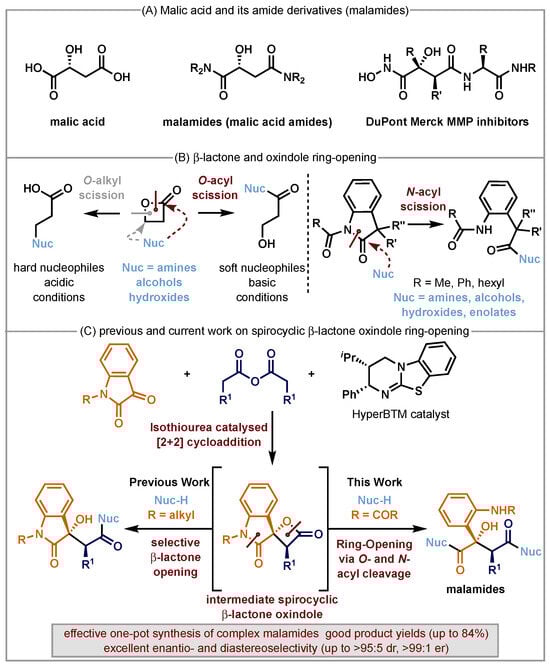 (A) Malic acid and malamide derivatives; (B) β-lactone and oxindole ring-opening; (C) previous and current work on spiro-oxindole-β-lactone ring-opening to generate malamide derivatives.