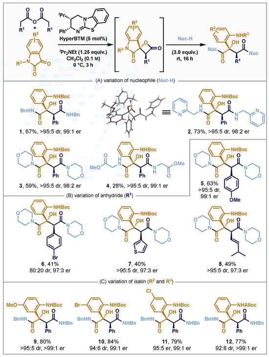 Reaction scope. (A) Variation of nucleophile, (B) variation of anhydride, (C) variation of isatin; typical reaction conditions: The respective isatin (0.50 mmol), homoanhydride (0.33 mmol) and HyperBTM (0.02 mmol) were dissolved in CH2Cl2 (8.5 mL), iPr2NEt (0.42 mmol) was added, and the reaction was stirred for 3 h at 0 °C. The respective nucleophile (1.00 mmol) was added, and the reaction was stirred overnight at room temperature. Enantiomeric ratios (er) were determined by HPLC analysis on a chiral stationary phase. Diastereomeric ratios (dr) were obtained by 1H NMR analysis of the purified reaction product as it could not be determined unambiguously from the crude reaction mixture. Yields are isolated yields.