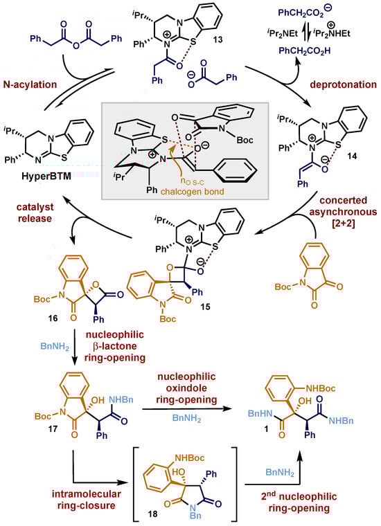 The proposed mechanism for the formation of malamide derivatives involves the previously reported enantioselective [2+2] cycloaddition strategy that is initiated through attack of the isothiourea Lewis base organocatalyst HyperBTM to phenylacetic anhydride, giving acyl ammonium species 13 (Figure 3). Deprotonation by the carboxylate counterion generates the C(1)-ammonium enolate intermediate 14 [36], which, based on previous computational studies with CF3-ketones, undergoes a concerted asynchronous [2+2] cycloaddition with N-Boc isatin via pre-transition state intermediate 14. Stereoselectivity is induced by the stereodirecting Ph group derived from the catalyst blocking the approach of the electrophile from the Re-face, with the enolate geometry rigidified by a nO→σ*S-C chalcogen bond [116,117,118,119,120,121,122,123]. The β-lactol intermediate 15 then collapses to regenerate the isothiourea catalyst HyperBTM and the corresponding spirocyclic β-lactone-oxindole 16. Upon addition of the nucleophilic amine (illustrated using benzylamine), it is assumed that ring-opening of the β-lactone is favoured to initially give 17. From 17, two potential pathways to product 1 can be envisaged. Simplistically, ring-opening of 17 may lead directly to 1. However, a potential explanation for the observation that only double ring-opened malamide products are obtained when using one equivalent of benzylamine, even though an excess of β-lactone is present, could involve in situ intramolecular ring-opening of the oxindole motif from 17, leading to a reactive pyrrolidindione intermediate 18, that in turn is ring-opened to generate the observed malamide product 1. We are currently unable to discriminate between these potential reaction pathways, but both lead to the observed product.