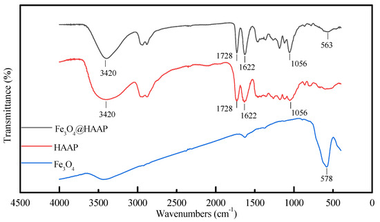 The FTIR spectra of Fe3O4@HAAP, HAAP, and Fe3O4 are shown in Figure 1. An obvious Fe-O stretching vibration peak was observed at 578 cm−1. At 563 cm−1 of Fe3O4@HAAP, a comparable, slightly smaller peak can be seen. This verified that the HAAP had been successfully coated on the surface of Fe3O4 [35]. The peaks at 3420 cm−1, 1728 cm−1, and 1622 cm−1 are attributable to the stretching vibration of the –OH group, C=O band, and N–H band [36,37,38]. The weakening of these peaks also demonstrated the success of Fe3O4@HAAP assembly.