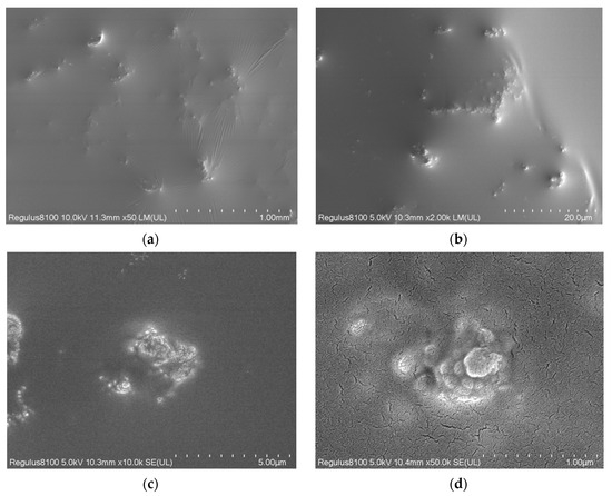 SEM images of Fe3O4@HAAP: (a) ×50; (b) ×2000; (c) ×10,000; (d) ×50,000.