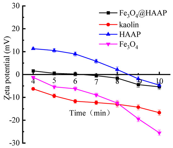 The zeta potentials of kaolin solution, Fe3O4, HAAP, and Fe3O4@HAAP are displayed in Figure 5. The zeta potential of kaolin was negative and the absolute value increased with the increase in pH. Due to the crystal structure formed by the alternately arranged Si–O tetrahedral layer and Al–O octahedral layer and the active group type on the surface being O2−, the surface of kaolin has a negative charge. For Fe3O4@HAAP, the zeta potential was −5.39~1.58 mV and the isoelectric point was about 6. These values were all between Fe3O4 and HAAP, which, because of the successful assembly of two materials, resulted in a change in the zeta potential of Fe3O4@HAAP.