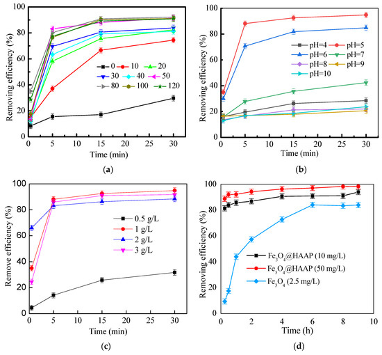 Fe3O4@HAAP was applied to treat kaolin simulated wastewater, and the different conditions were explored. The experimental results are shown in Figure 6. In order to compare the effects of different dosages, 0~120 mg/L of Fe3O4@HAAP was added to the wastewater, respectively. When the dosages were below 40 mg/L, the removing efficiency was less than 85% at 30 min. While the dosages further exceeded 50 mg/L, the removing efficiency was over 90% at 30 min. The removing efficiency reached 91.53% when the dosage was 50 mg/L (Figure 6a). Under acidic conditions, the zeta potential of Fe3O4@HAAP was positive and the surface was positively charged. The material could be combined with the negatively charged kaolin by electroneutralization to achieve the agglomeration. However, the low-dose flocculant was not enough to realize the electric neutralization mechanism, and reduced the possibility of collision, which caused the poor flocculation effect. In addition, the excessive dosage caused the contact site between the kaolin particles and the flocculant to be covered, the bridging effect was weakened, and the electrostatic repulsion between the floc was dominant, which made the floc unstable and was not conducive to the agglomeration of particles.