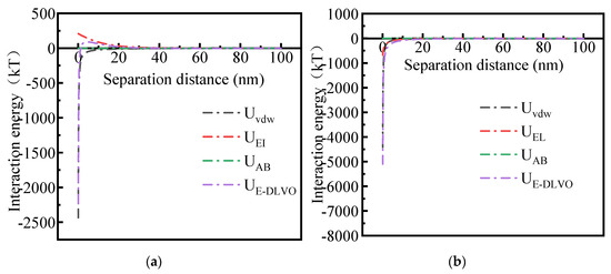In the DLVO theory calculation model, the van der Waals force is the dipole between the molecules or the atoms of two particles, resulting in an interaction between the atoms or molecules of the two particles. Electrostatic force refers to the force generated by the interaction of double electric layers between particles. In DLVO theory, the total interaction energy between particles depends on the interaction potential energy generated by the van der Waals interaction (UVDW) and the electrostatic interaction force energy caused by the compression double layer (UEI) [48]. However, the extended DLVO (EDLVO) theory revises the classical DLVO theory by supplementing the Lewis acid–base polar (AB) force. There is a polar force between particles that can explain the repulsive force due to hydration and the electrostatic force at the hydrophilic and hydrophobic interfaces [49]. Therefore, in EDLVO theory, the total interaction energy between particles is determined by UVDW, UEI, and UAB [50].