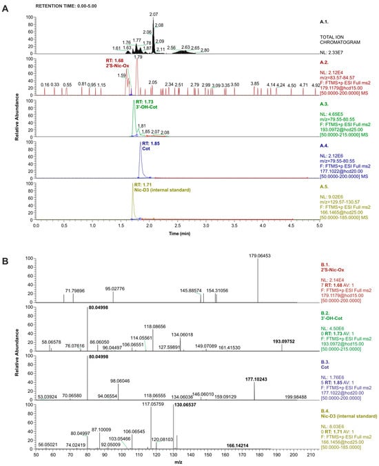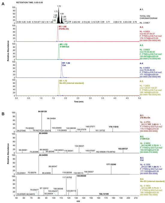 (A): LC-Orbitrap-MS/MS chromatograms recorded in total ion mode (top window) and PRM mode (other windows) for nicotine metabolite standards and internal standards (concentration of 0.25 µg/mL; injection: 1 µL). (B): Mass spectra recorded in PRM mode of the standards used in the study, shown from the top in order as in Figure 1A, i.e. 2′S-Nic-Ox, 3′-OH-Cot, Cot, and Nic-D3 (internal standard). The appropriate collision energies are presented in Table 2.