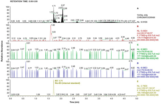LC-Orbitrap-MS/MS chromatograms recorded in total ion mode (top window) and PRM mode (consecutive windows from the top corresponding to 2′S-Nic-Ox, 3′-OH-Cot, Cot, and Nic-D3) for the urine extract of a non-smoker. Nic-D3 concentration was 0.3 µg/mL (injection volume: 1 µL).
