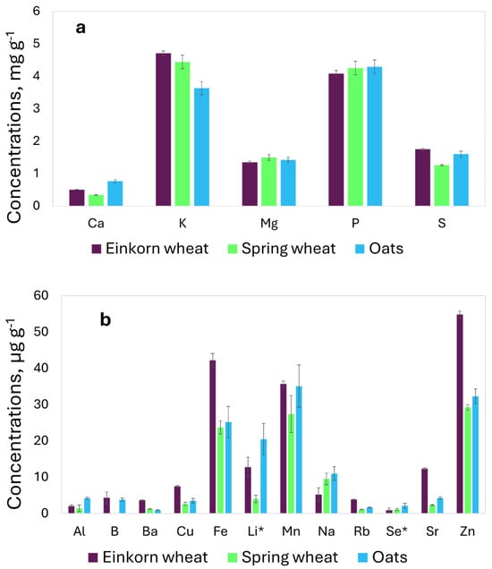 Element concentrations in commercial samples of einkorn wheat (T. monococcum), spring wheat (T. aestivum), and oats (A. sativa): (a) major elements in mg g−1; (b) trace elements in μg g−1, Li*, and Se* μg × 100 g−1.