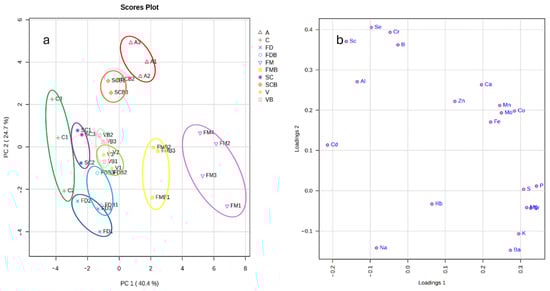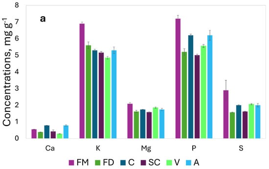 The first component, high loadings, responsible for the separation of FM and FMB from the other species, is mainly related to the major nutrients (S, Mg, P, and K), which showed high concentrations in these samples (Figure 2a). The C samples were characterized by the variable Cd, which showed the lowest loading value in the first component.