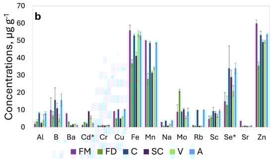 The survey evaluated the content of the additional elements (Cd, Cr, Mo, and Sc) to verify the differences among the studied species for their ability to accumulate trace elements of particular interest at the seed level; Mo is an important trace element because it is a cofactor in enzymatic systems [22,23]; Cd, Cr, and Sc are phytotoxic elements and are hazardous to human and animal health [25,26]. The element composition of the cereals grown by conventional agriculture is reported in Figure 2 (Figure 2a for the major nutrients and Figure 2b for the trace elements).