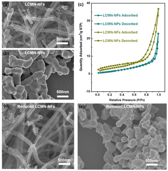 SEM images of as−prepared LCMN−NFs (a) and LCMN−NPs (b), N2 adsorption−desorption isotherms of LCMN−NFs and LCMN−NPs (c), and SEM images of reduced LCMN−NFs (d) and LCMN−NPs (e).
