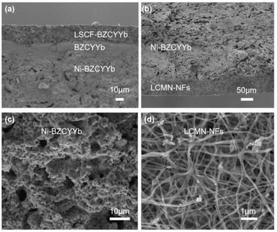 Microstructure of single cell: (a) LSCF−BZCYYb cathode/BZCYYb electrolyte/Ni−BZCYYb anode; (b) LCMN−NF catalyst layer/Ni−BZCYYb anode; (c) Ni−BZCYYb anode; and (d) LCMN−NF catalyst layer after reduction.