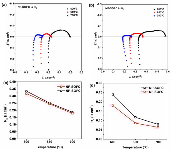 Open-circuit impedance spectra of NF−SOFC (a) and NP−SOFC (b) with H2 fuel at temperatures between 600 and 700 °C. Comparisons of ohmic (c) and polarization (d) resistances between NF−SOFC and NP−SOFC.