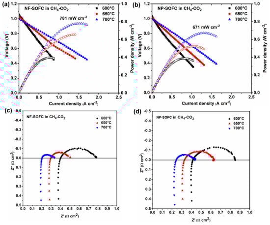 Electrochemical performances of NF−SOFC and NP−SOFC fueled by CH4−CO2: (a) I−V−P curves of NF−SOFC; (b) I−V−P curves of NP-SOFC; (c) EIS of NF−SOFC; and (d) EIS of NP−SOFC. (The solid symbols in (a,b) represent for Voltage and the hollow symbols represent for Power density).