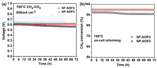 Performance durability of NF−SOFC and NP−SOFC fueled by CH4−CO2 at 700 °C for 72 h: (a) time-dependent cell voltage at 600 mA cm−2 and (b) time dependence of CH4 conversion.